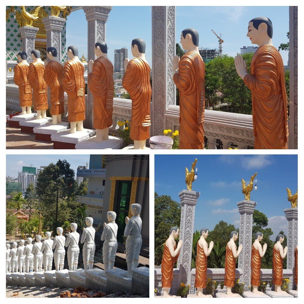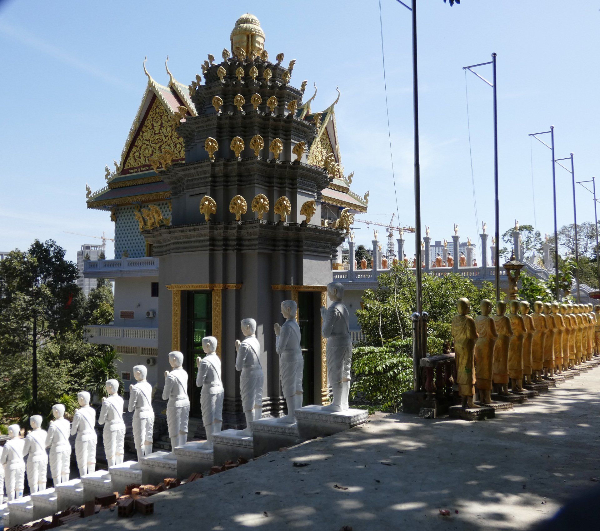 Cuando las obras estén terminadas será magnífica, como también lo será la ciudad. Actualmente en construcción, calles, rascacielos, casinos, hoteles, parece una ciudad bombardeada, prácticamente la están haciendo nueva. Finalizamos con la visita al templo de Wat Krom. La estatua del Buda reclinado merece especial atención. Dentro del templo pudimos ver un poco la vida de los monjes. Terminada la excursión nos fuimos a comer al barco.