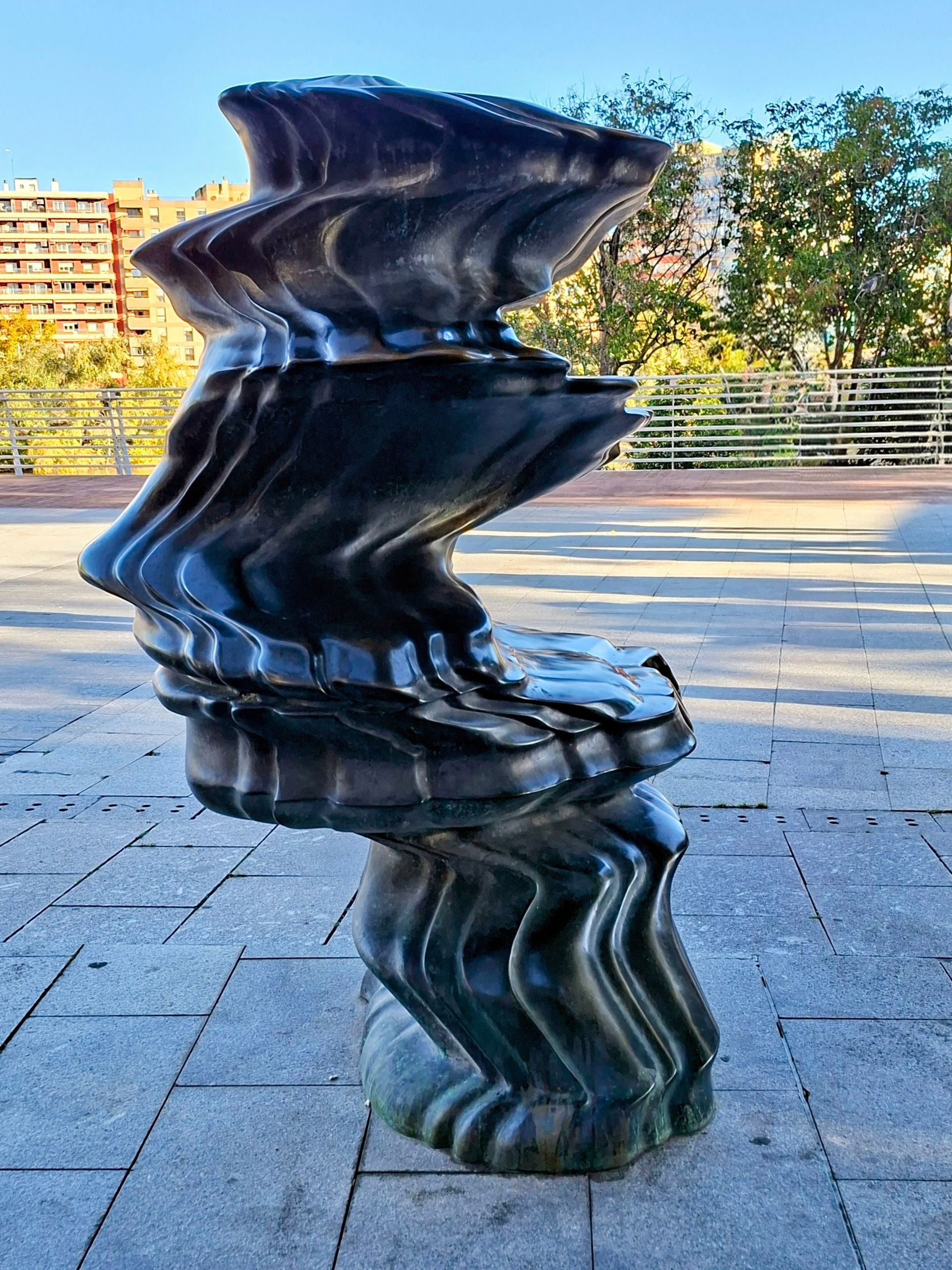 Empezamos ruta cruzando el Paseo Echegaray y Caballero para fotografiar: los leones del puente de piedra, emblema de Zaragoza que al igual que el Caballito son obra de Francisco Rallo; la escultura "Pariente salvaje", figura con forma de busto que sugiere estar sometida a los efectos del viento, legado de la Expo y obra de Tony Gragg; los pedestales de acero corten que sostienen los focos que iluminan el Pilar y, por supuesto, las torres de la Basílica.