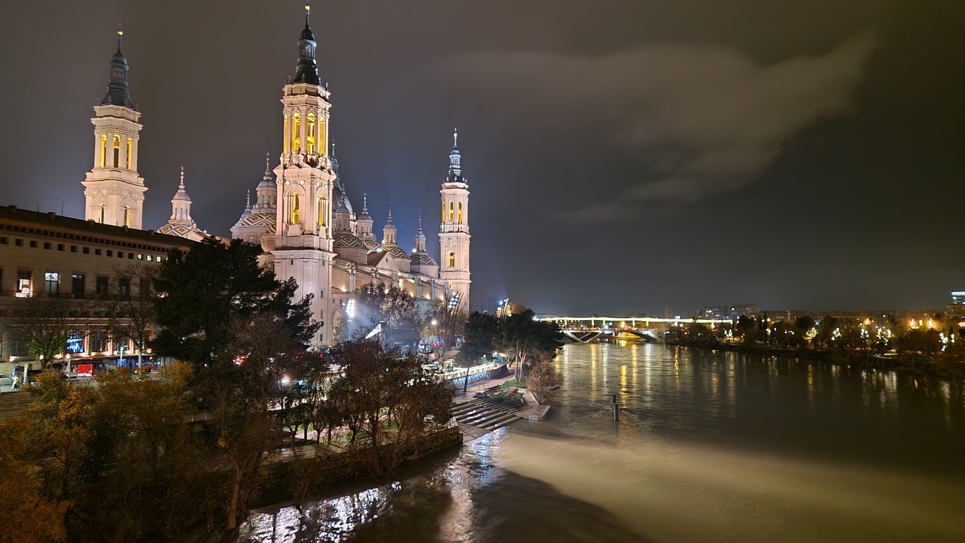 A continuación, nos asomamos al Puente de Piedra, decorado con estrellas navideñas y columnas luminosas, desde donde, además, podemos fotografiar la Basílica del Pilar.