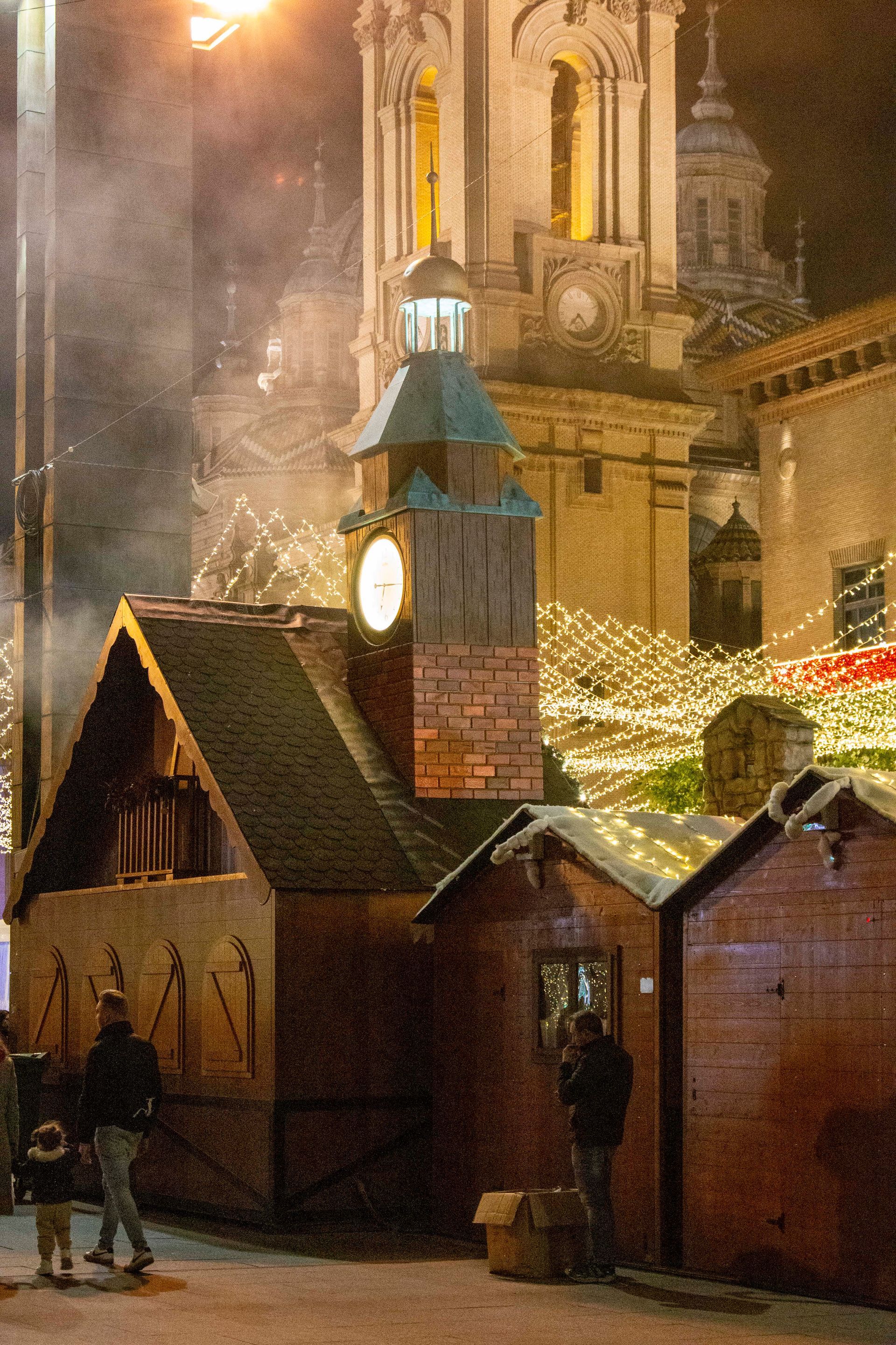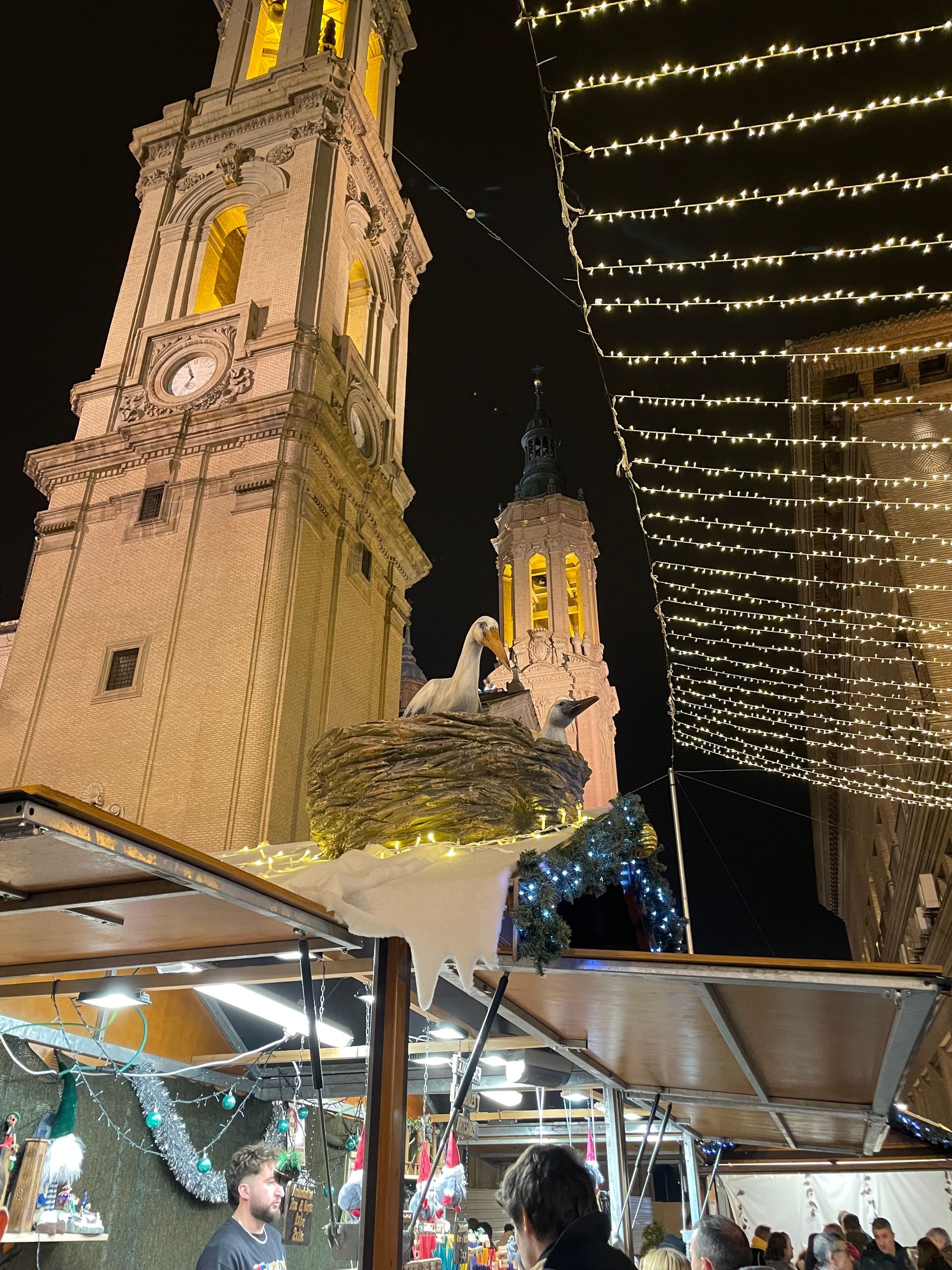 De nuevo en marcha, a través de la calle Torre Nueva, volvemos a la calle Alfonso para llegar al punto neurálgico de la Navidad en la ciudad, la plaza del Pilar. En primer lugar caminamos por el lado de la Basílica, donde los puestos del Mercadillo, el Árbol de los Deseos, el Buzón Real y el edificio del Ayuntamiento, decorado como una caja de regalo, competirán por llamar nuestra atención y nuestra creatividad fotográfica.