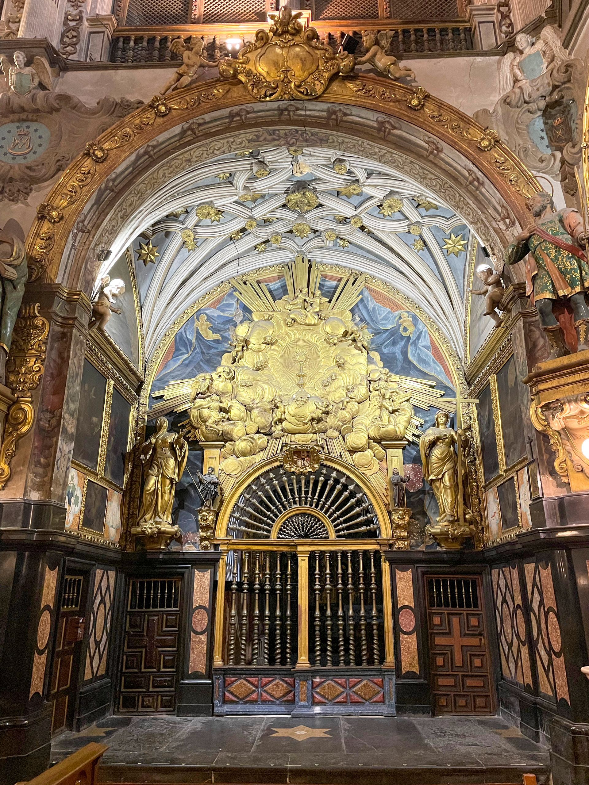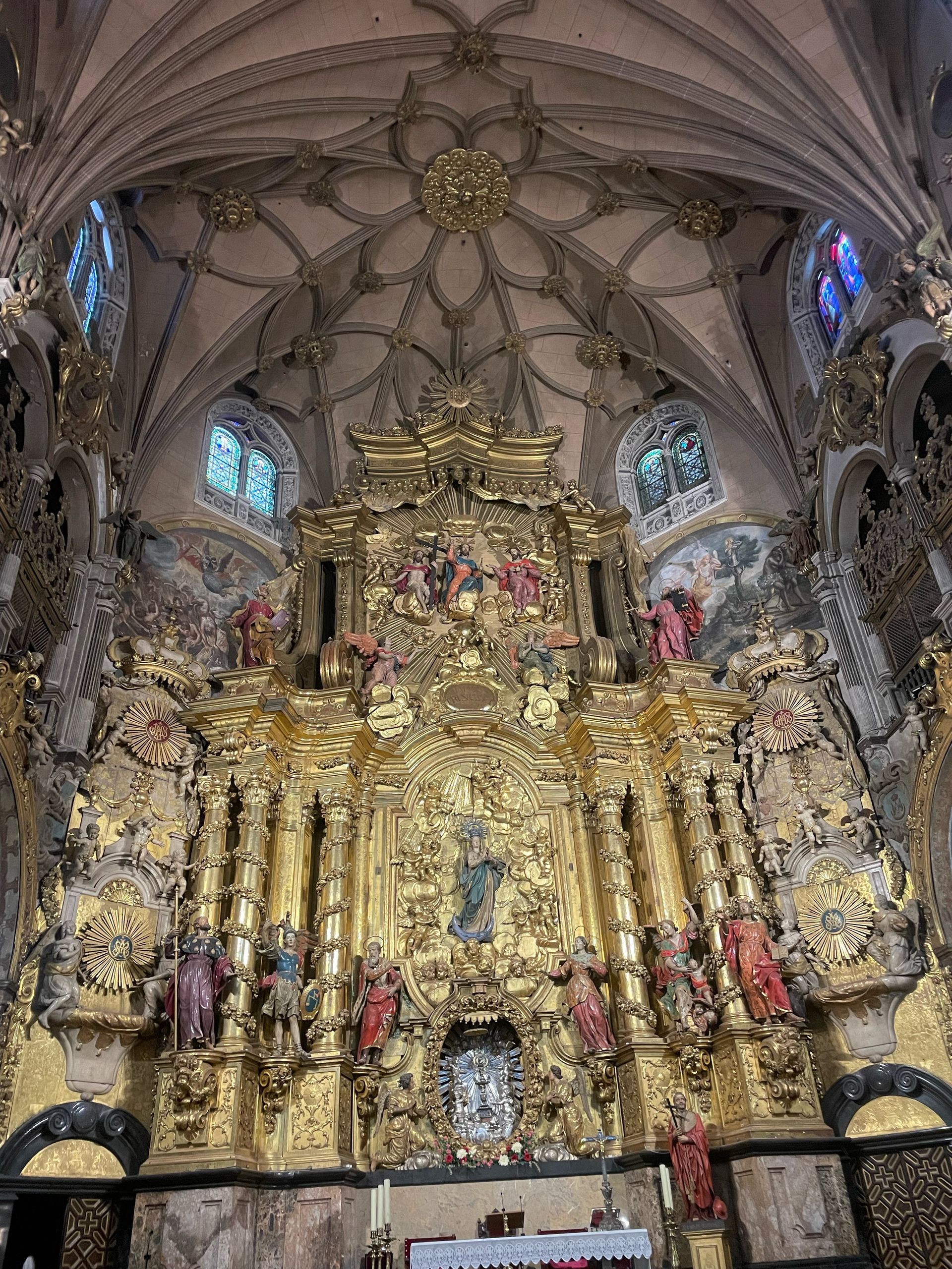 El retablo mayor está dedicado a la Inmaculada con 18 esculturas a tamaño natural en estilo barroco de transición al rococó.